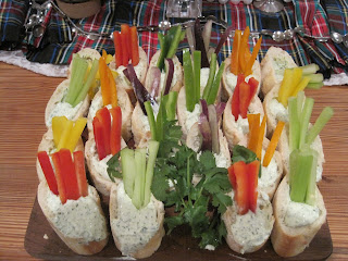 Here's how I did it: I bought a long, skinny French baguette. Around here, we can only get white, plain ones, but it would be pretty to have different kinds of bread. So, I began by cutting an end off the loaf; then I made a diagonal cut about 1" on the short end and about 2" on the long sides. Then, the next cut would be straight across, which would result in another 1"-2" piece. I think you can see what I am talking about in the picture. Every other cut would be diagonal. I then set each piece on the flat end with the short side facing me. I gently pinched out some of the interior bread of each piece. You want to leave the very bottom intact, but you want enough room to stick in the veggies and to hold the dip. On a couple of pieces, I accidentally went all the way through. No problem,I just put a very thin slice of butter in the "bread cup" to cover the hole. That worked great. Then, I put about 4 sticks of veggies--red, yellow, orange, green peppers, and celery down in the bread cup and added the dip, which helped to hold up the veggie sticks.